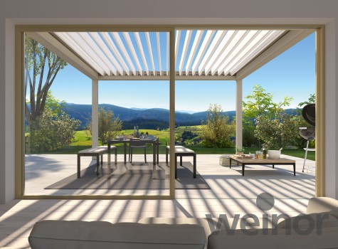 Durch das Öffnen der geräuscharmen Lamellen kann Warmluft entweichen und die Temperatur auf der Terrasse bleibt angenehm – Experten sprechen hier von einer bioklimatischen Wirkung.