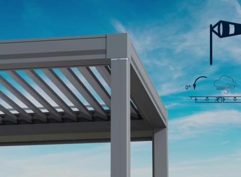 Die Steuerung erfolgt automatisch durch einen Sonnen-Wind-Regensensor. Wenn es regnet, schließt er die Lamellen, und das Wasser wird nach unten abgeleitet. Natürlich können Sie Artares auch mit deinem Handsender steuern.