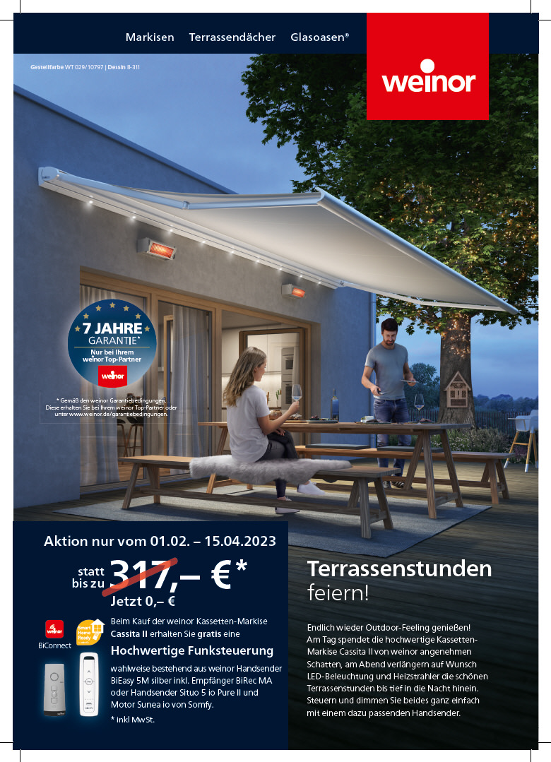 Die hochwertigen Markisen von Weinor sorgen dabei für großzügige und unbeschwerte Sommerfreuden. Für kleinere Terrassen empfehlen wir einen Blick auf unser Sortiment„Balkon & Loggia“. Lassen Sie sich inspirieren.